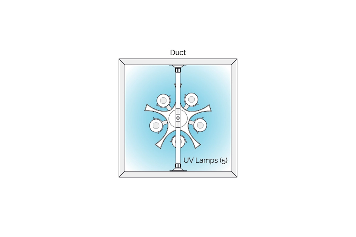 The Bio-Wall™ UV air purification system is installed in the return or supply ducting of an HVAC system. The system is comprised of 5 lamps, each secured in their own parabolic aluminum reflector for maximum UV intensity. In addition, the Bio-Wall™ is installed parallel to airflow to achieve the maximum amount of contact time with the airborne contaminants.