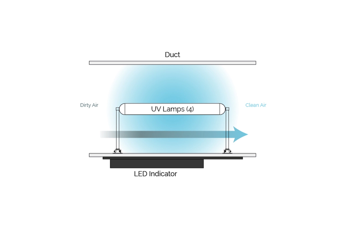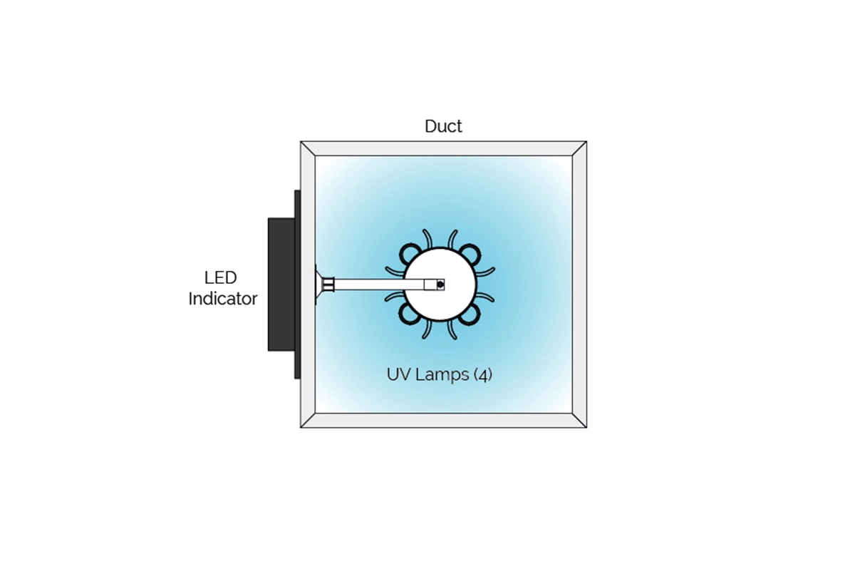 The Quattro is installed in a return or supply duct parallel to airflow for maximum exposure time and consists of four 18" lamps, each with their own parabolic aluminum reflector.